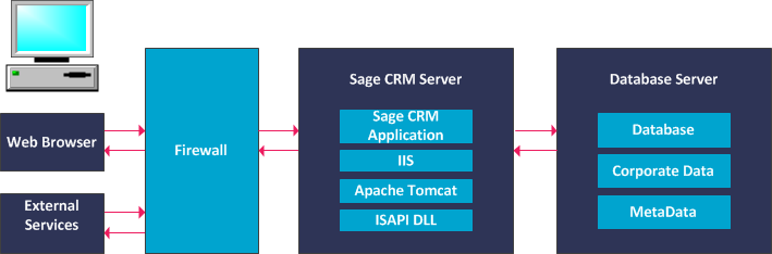 Sage CRM is a 32-bit application which can run on a 64-bit server. Sage CRM installations comprise of a Sage CRM server and a database server. As Sage CRM is a web-based solution, each user needs a web browser and IP connection to the Sage CRM server to access the system.
